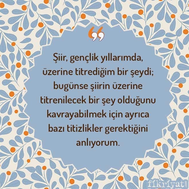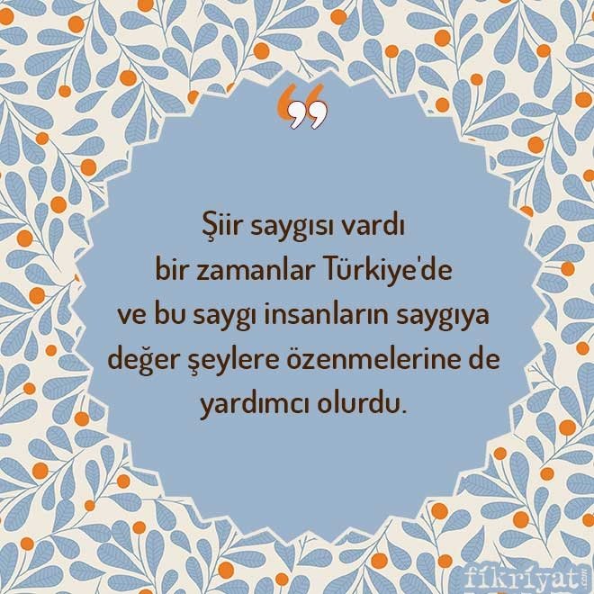 📌 "Şiir saygısı vardı bir zamanlar Türkiye'de ve bu saygı insanların saygıya değer şeylere özenmelerine de yardımcı olurdu. Şairlerden, şairlerin şiire duydukları saygıdan başlayarak yaygınlık sağlardı bu soyluluk ortamı. Şairler yazdıkları üzerine titrerler, bu duyarlık şiir okuyucusunda hak ettiği karşılığı bul urdu. Şiir okuyucusu şairin gösterdiği inceliği kendisine gösterilmiş bir saygı kabul eder, önemli bulduğu şairdeki özensizliği kendine yönelmiş bir hakaret sayardı. Ben şiiri böylesi bir ortamda tanıdım."