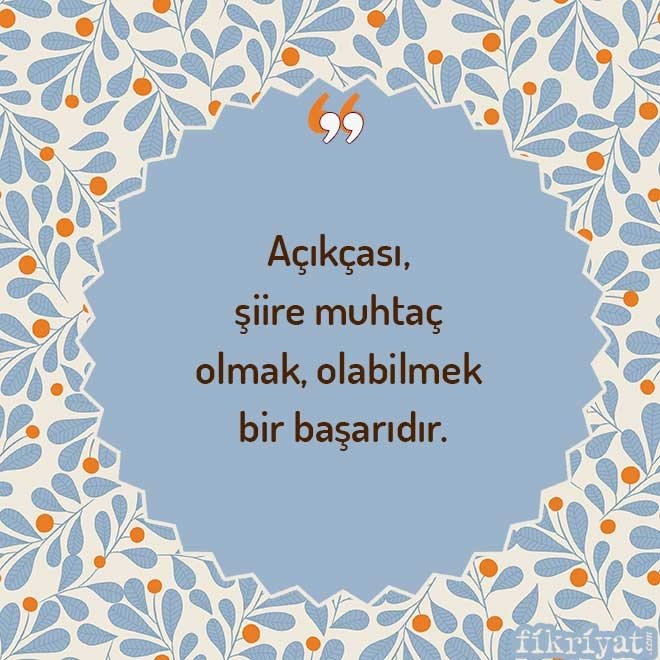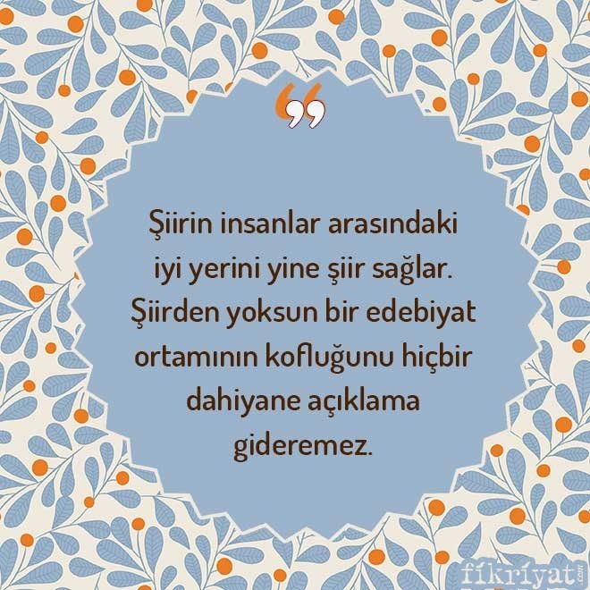 📌 "İnsanın insanlarla olan bağlantısı ve insanın çevresiyle olan ilişkisi yüzünden yüreğinde, kafasında beliren çatlak belli bir duyarlık sahibi herkesi şiir okumaya muhtaç hale getirir. Getirmiyorsa artık kafaların, yüreklerin yerli yerinde bir işleyişi kalmamış demektir. Açıkçası, şiire muhtaç olmak, olabilmek bir başarıdır."