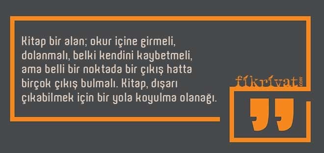 "Kitap bir alan; okur içine girmeli, dolanmalı, belki kendini kaybetmeli, ama belli bir noktada bir çıkış hatta birçok çıkış bulmalı. Kitap, dışarı çıkabilmek için bir yola koyulma olanağı."