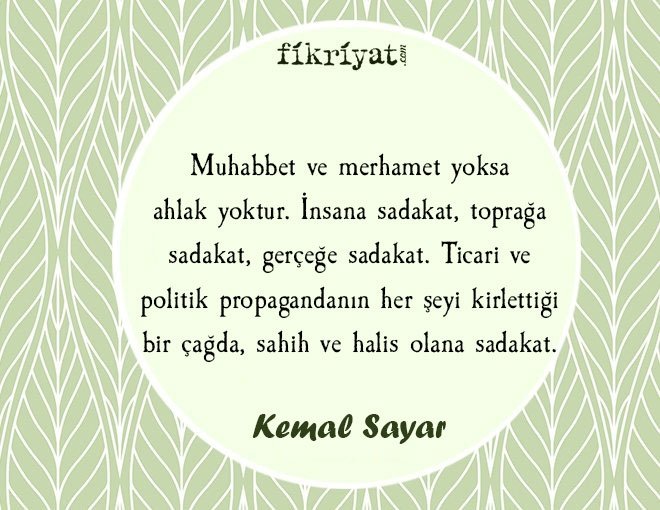 🔶🔸 Muhabbet ve merhamet yoksa ahlak yoktur. İnsana sadakat, toprağa sadakat, gerçeğe sadakat. Ticari ve politik propagandanın her şeyi kirlettiği bir çağda, sahih ve halis olana sadakat.
