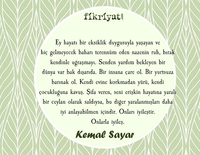 🔶🔸 Ey hayatı bir eksiklik duygusuyla yaşayan ve hiç gelmeyecek baharı terennüm eden nazenin ruh, bırak kendinle uğraşmayı. Senden yardım bekleyen bir dünya var bak dışarıda. Bir insana çare ol. Bir yurtsuza barınak ol. Kendi evine korkmadan yürü, kendi çocukluğuna kavuş. Şifa veren, seni erişkin hayatına yaralı bir ceylan olarak saldıysa, bu diğer yaralanmışları daha iyi anlayabilmen içindir. Onları iyileştir. Onlarla iyileş.