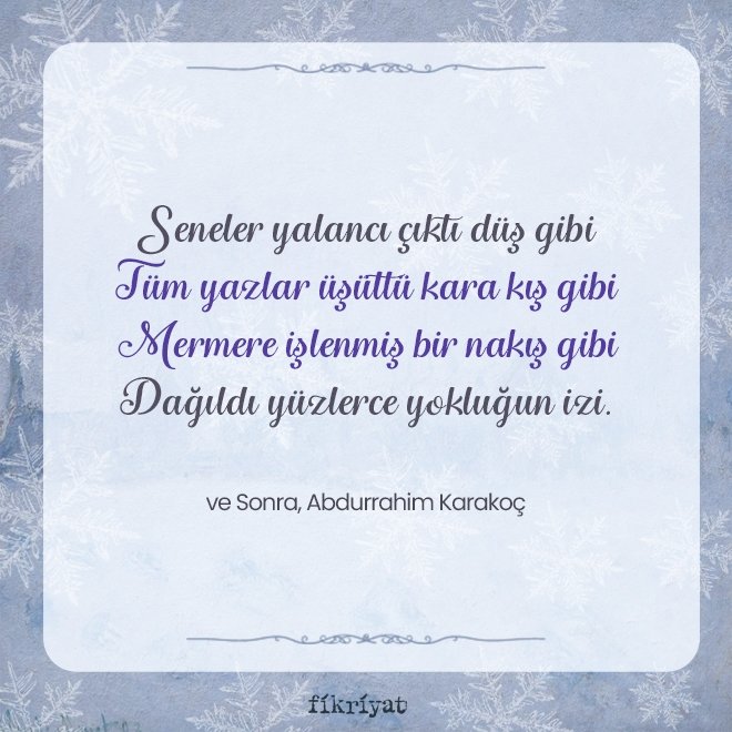 Her mevsim başka bir ruha açılır. İnsan kendini değişen her mevsimde yeniler ve dönüştürür. Şairler ise bu dönüşümü mevsimler üzerinden örnekleyerek anlatırlar. Bahar sevincin ve aşkın ayı iken sonbahar, hüznü çağrıştırır. Kış ise ayrılığın ve acının katmerlendiği, yüreklerin üşüdüğü bir mevsim olarak şiirlerde karşımıza çıkar. Hazır mevsimindeyken ünlü şairlerimizin yazdığı kış dizelerini sizler için derledik.