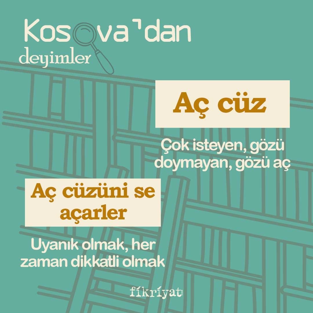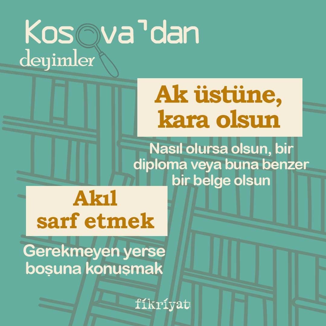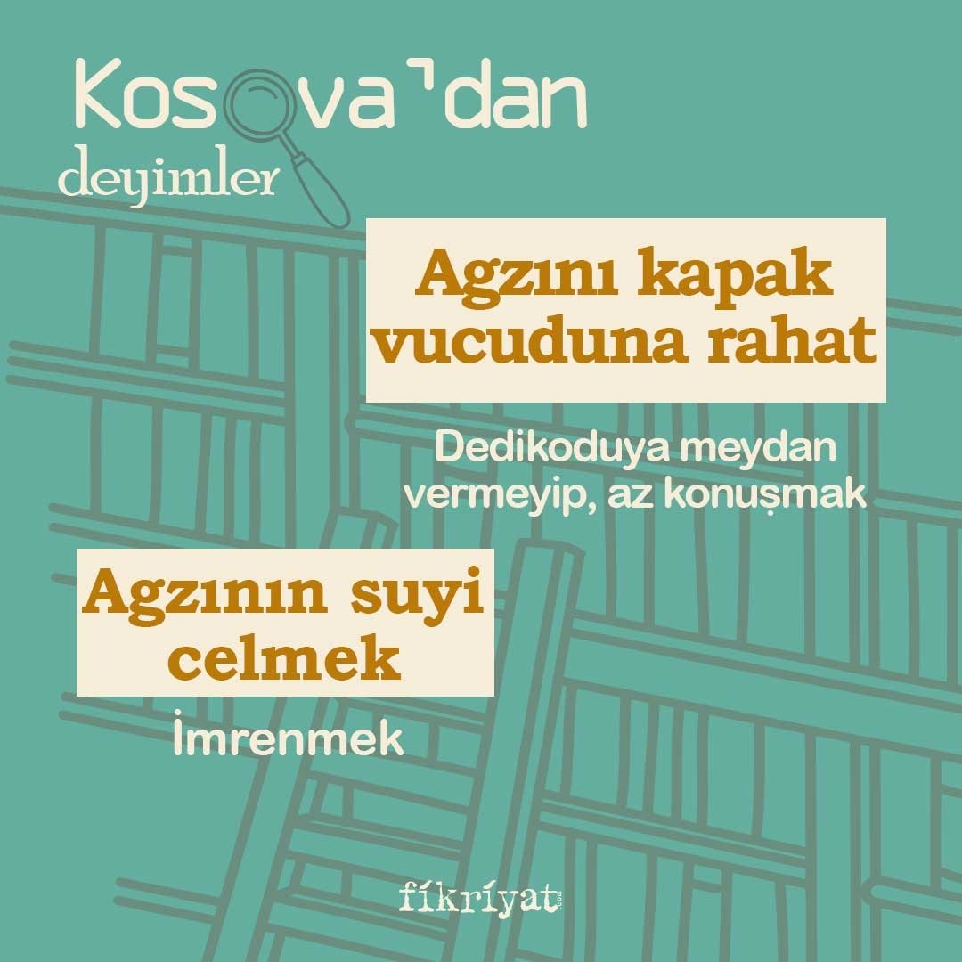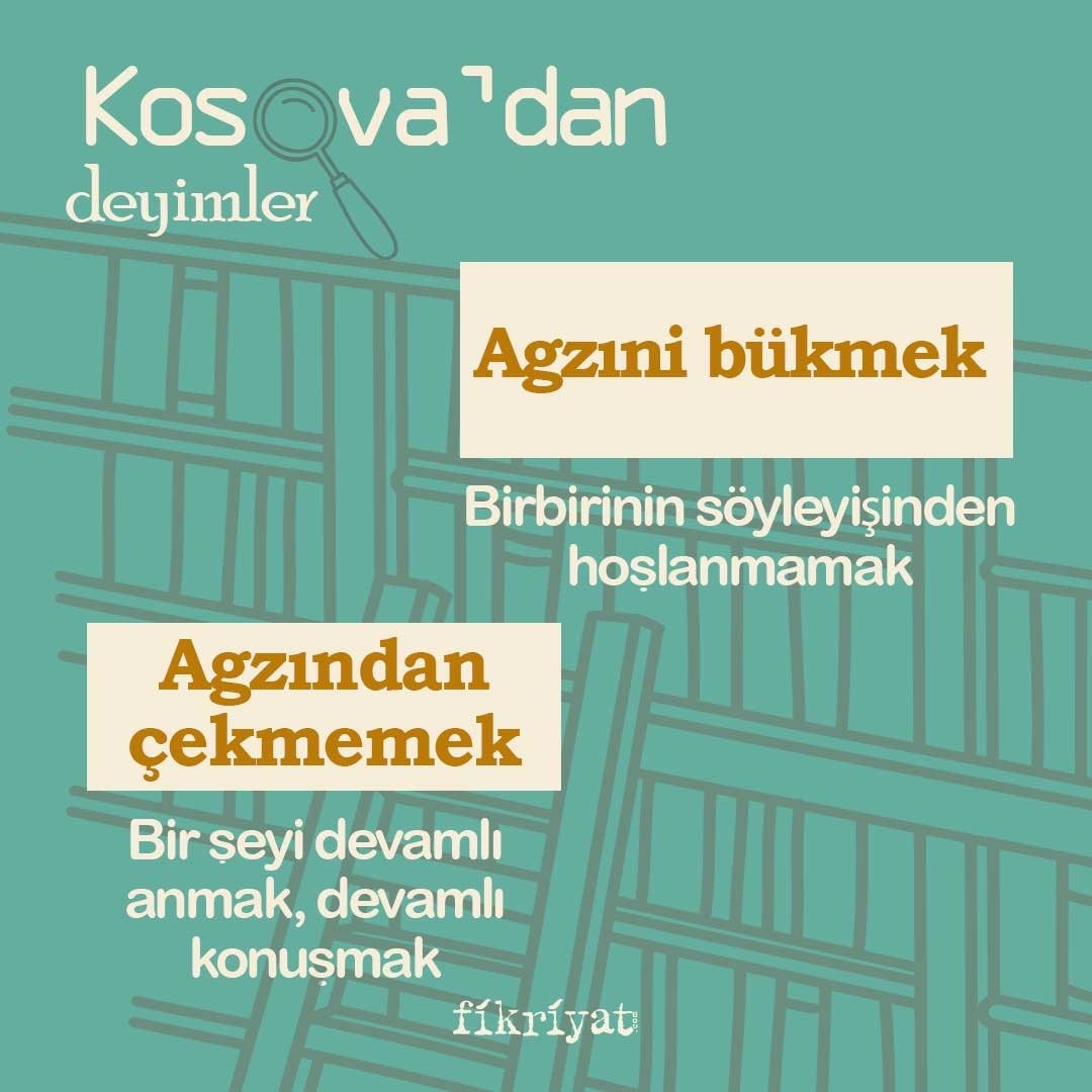 Osmanlı Devleti, Balkan topraklarına uzun yıllar hakim oldu. Bu topraklardan bizlere, sözlü kültürün en önemli ögelerinden olan "deyimler" miras olarak kaldı. Gelecek nesillere aktarılan ve aktarılmaya devam eden deyimlerin, Kosova'nın şehirlerinden; Priştine, Prizren ve Mamuşa ağızlarına ait örneklerini sizler için derledik.