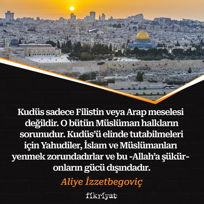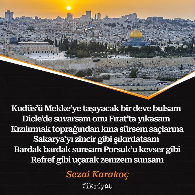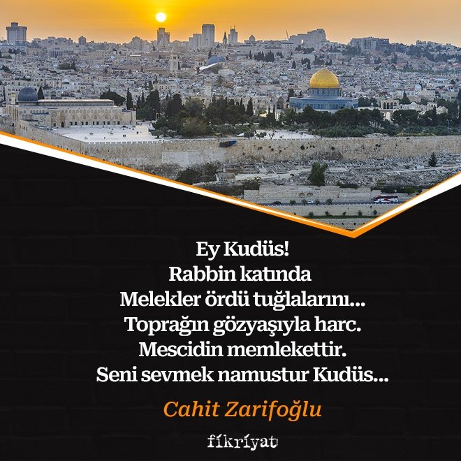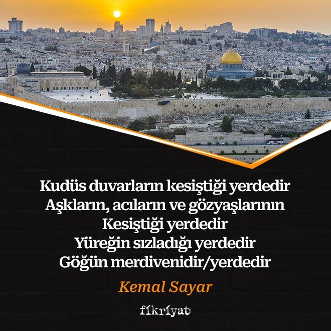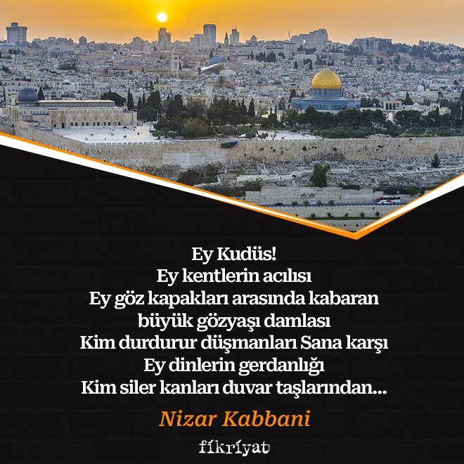 Kadim şehir Kudüs, üç semavi din için de kutsal sayılır. Müslümanların hakimiyeti altında olduğu dönem dışında yaşanan çatışma ve huzursuzluklar ile gündeme gelen Kudüs, Müslümanların ilk kıblesi olan Mescid-i Aksa'yı içinde barındırması hasebiyle önem arz eder. Müslümanlar için kapanmayan bir yara olan Kudüs meselesini birçok mütefekkirimiz dert edinerek konu hakkında yazılar ve şiirler kaleme almıştır. Sizin için Kudüs'e dair alıntılar derledik.