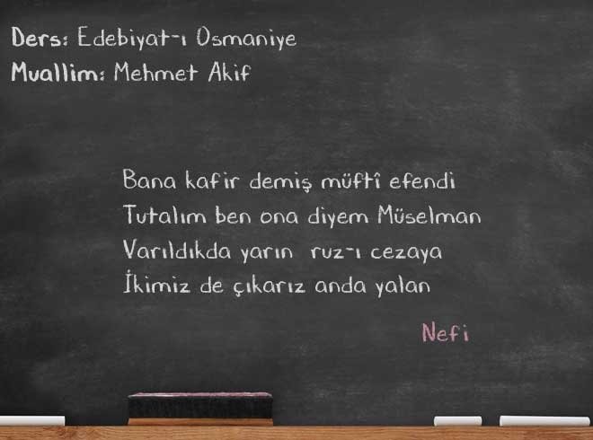 ➡ Mehmet Akif, aruz ve türleri dersinde kafiye bahsini işlerken anlattıklarına şiirlerle örneklendirdi. Bunlardan biri Şeyhülislam Yahya Efendi ile Nefi'nin birbirleri için yazdıkları dizelerdi: