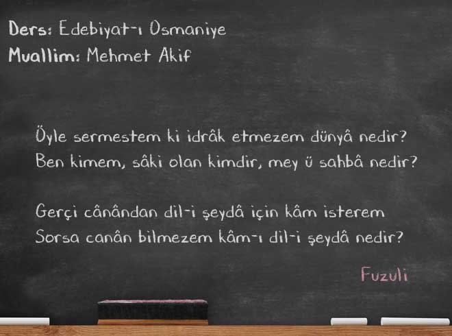 ➡ Akif'in nazım türleri dersinde gazel bahsinde Fuzuli'den söz eder. Döneminde artık rağbet görmeyen bu şiir türünün en önde gelen temsilcisi olduğunu söyler.