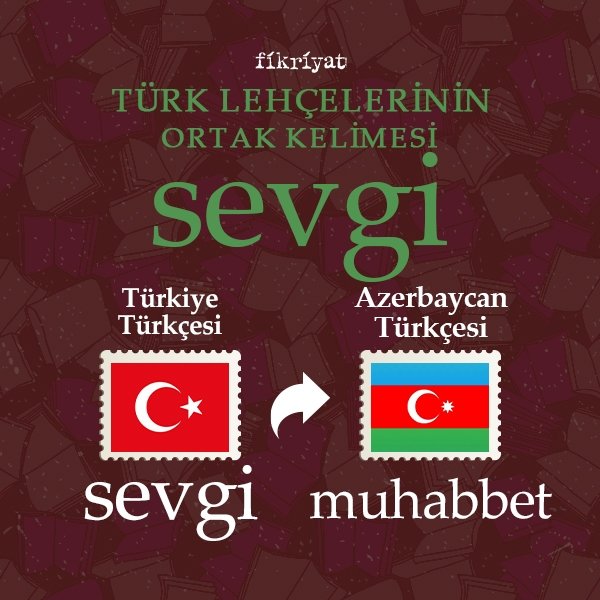 🔸 Türkiye Türkçesine yakınlığı ile bilinen ve aynı zamanda Oğuz grubunda yer alan Azerbaycan Türkçesinde "sevgi" kelimesini "muhabbet" sözcüğü karşılamaktadır. Muhabbet kelimesinin yanında "sevgi" kelimesi de varlığı söz konusudur.