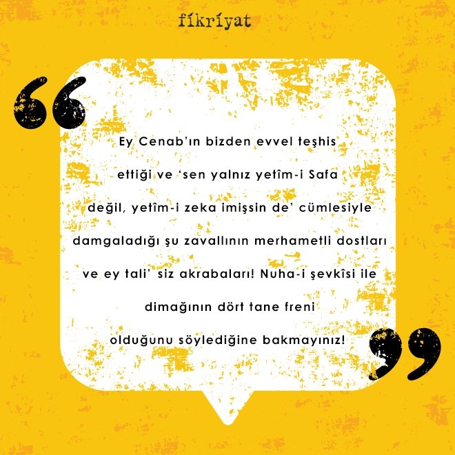 "Ey Cenab'ın bizden evvel teşhis ettiği ve 'sen yalnız yetîm-i Safa değil, yetîm-i zeka imişsin de' cümlesiyle damgaladığı şu zavallının merhametli dostları ve ey tali'siz akrabaları! Nuha-i şevkîsi ile dimağının dört tane freni olduğunu söylediğine bakmayınız! Daha doğrusu bu sözlerine bakınız da, bu biçareyi, vakit kaybetmeksizin, bir an evvel fennin şefkatine emanet ediniz!"