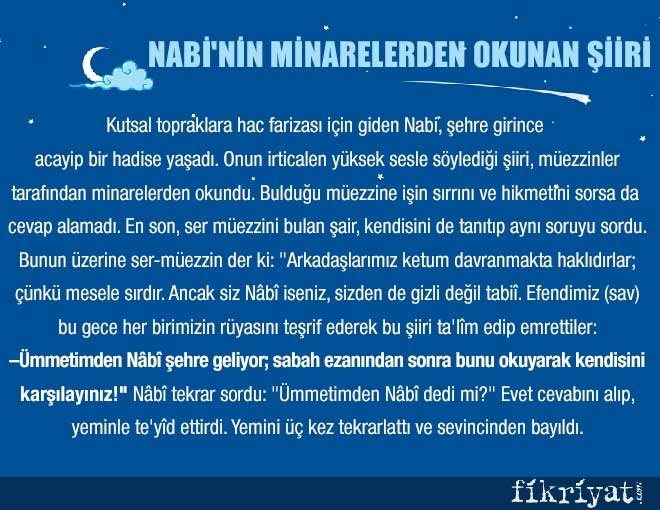 Kutsal topraklara hac farizası için giden Nabi, şehre girince acayip bir hadise yaşandı. Onun irticalen yüksek sesle söylediği şiiri, müezzinler tarafından minarelerden okundu. Bulduğu müezzine işin sırrını ve hikmetini sorsa da cevap alamadı. En son, ser müezzini bulan şair, kendisini de tanıtıp aynı soruyu sordu. Bunun üzerine ser-müezzin der ki: "Arkadaşlarımız ketum davranmakta haklıdırlar; çünkü mesele sırdır. Ancak siz Nâbî iseniz, sizden de gizli değil tabiî. Efendimiz (sav) bu gece her birimizin rüyasını teşrif ederek bu şiiri ta'lîm edip emrettiler: Ümmetimden Nâbî şehre geliyor; sabah ezanından sonra bunu okuyarak kendisini karşılayınız!"