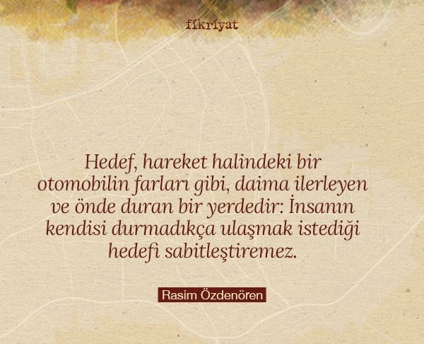 Hedef, hareket halindeki bir otomobilin farları gibi, daima ilerleyen ve önde duran bir yerdedir: İnsanın kendisi durmadıkça ulaşmak istediği hedefi sabitleştiremez.