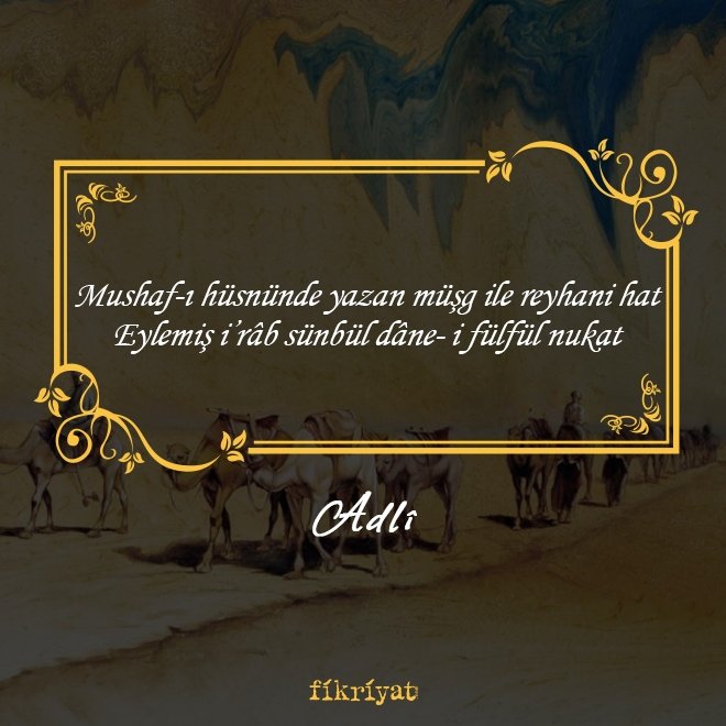 🔸 Adlî mahlasıyla tanınan Sultan Bayezid bu beyitinde hat sanatına ait unsurları bir araya getirir. Bu dizelerde bahsettiği reyhani, ince kalemle yazılan hat sanatının türlerinden birisidir.