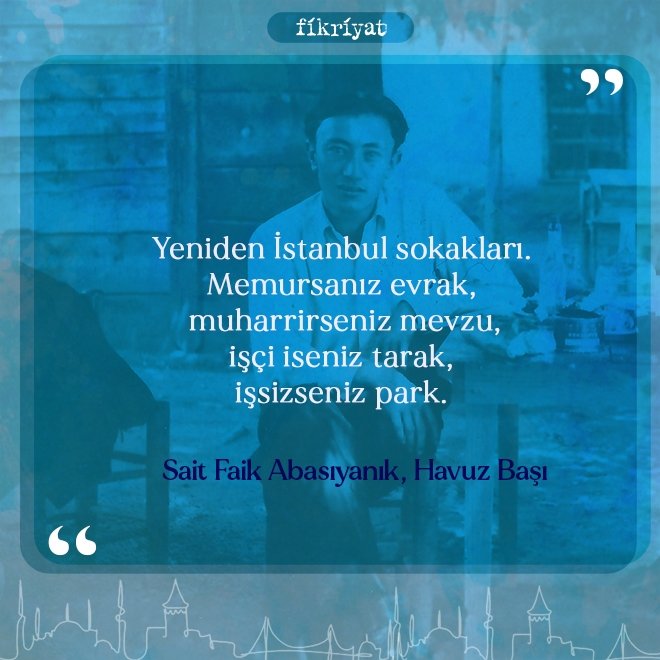 "Yeniden İstanbul sokakları. Memursanız evrak, muharrirseniz mevzu, işçi iseniz tarak, işsizseniz park." (Sait Faik Abasıyanık, Havuz Başı)