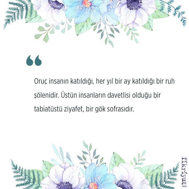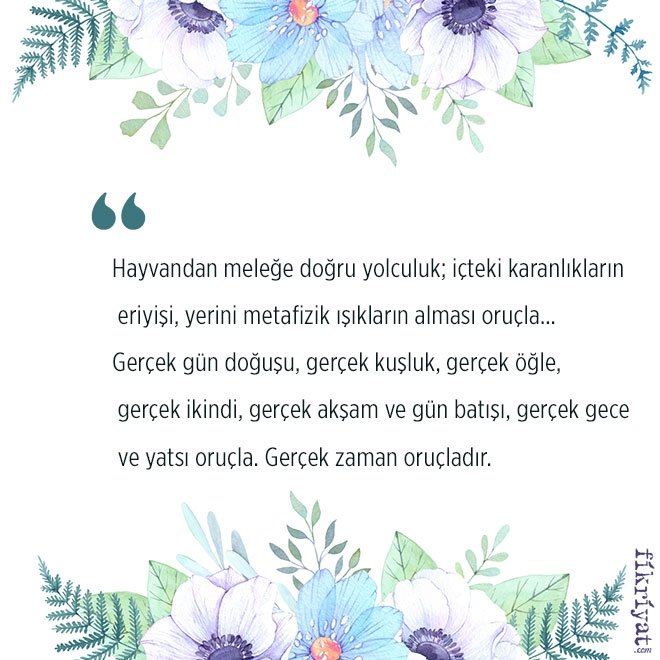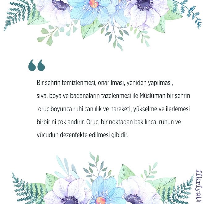 Bir ev nasıl yılda bir defa temizlenir, örümcek ağlarından kurtarılır, kiremitleri aktarılır, sıvanır, yıkanır, onarılır ve badana edilir, yani yeni yapılmış hale getirilirse, bir ruh da, yılda bir kere, böyle bir genel temizlik ve revizyon ister. Bir şehrin temizlenmesi, onarılması, yeniden yapılması, sıva, boya ve badanaların tazelenmesi ile Müslüman bir şehrin oruç boyunca ruhî canlılık ve hareketi, yükselme ve ilerlemesi birbirini çok andırır. Oruç, bir noktadan bakılınca, ruhun ve vücudun dezenfekte edilmesi gibidir.