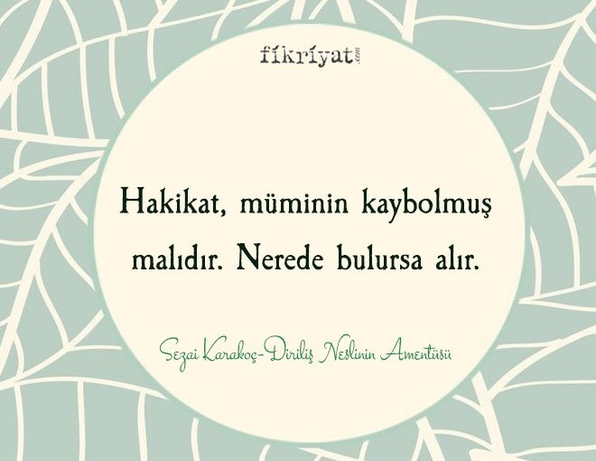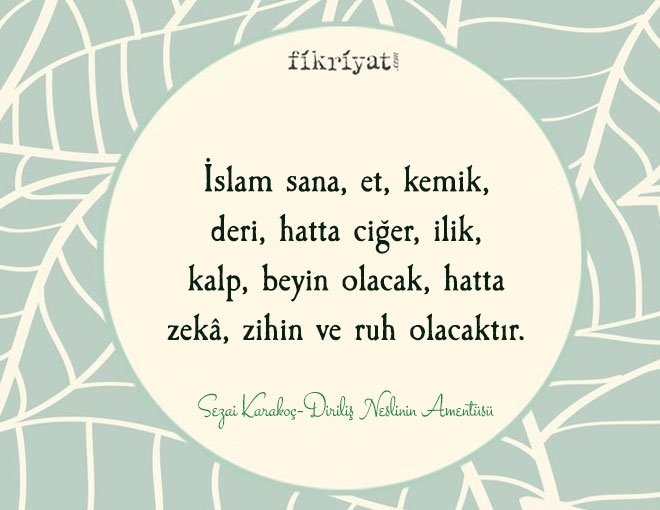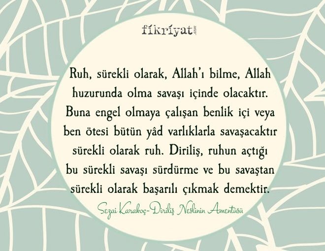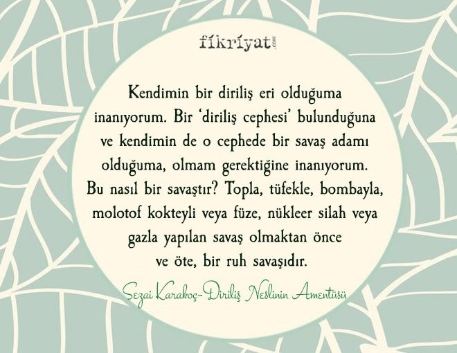 Kendimin bir diriliş eri olduğuma inanıyorum. Bir 'diriliş cephesi' bulunduğuna ve kendimin de o cephede bir savaş adamı olduğuma, olmam gerektiğine inanıyorum. Bu nasıl bir savaştır? Topla, tüfekle, bombayla, molotof kokteyli veya füze, nükleer silah veya gazla yapılan savaş olmaktan önce ve öte, bir ruh savaşıdır. Ruhlar arasında olan bir savaştır. Bu savaşlarda bedenlerden, maddî vücutlardan önce ruhlar, mânevi vücutlar, yani varoluşlar düşer, tutsak olur, yenilgiye uğrar. Ya da tersine düşürür, tutsak eder, yenilgiye uğratır. Bu bir zihniyet savaşıdır. Karayla akın savaşıdır. Bu bir hayat tarzı, dünya görüşü, yani bir medeniyet savaşıdır.