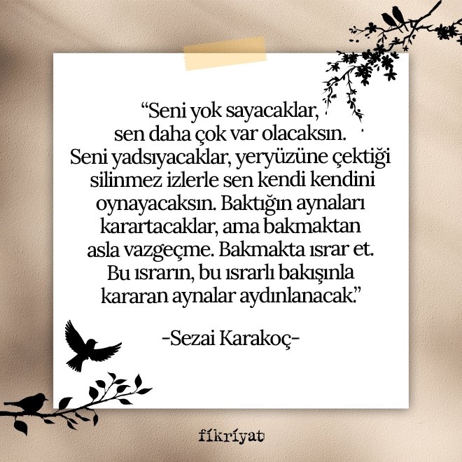 "Seni yok sayacaklar, sen daha çok var olacaksın. Seni yadsıyacaklar, yeryüzüne çektiğin silinmez izlerle sen kendi kendini oynayacaksın. Baktığın aynaları karartacaklar, ama bakmaktan asla vazgeçme. Bakmakta ısrar et. Bu ısrarın, bu ısrarlı bakışınla kararan aynalar aydınlanacak."