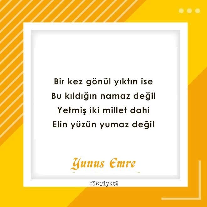 Hadisten anlaşıldığı üzere insan kalbi mukaddestir. Bundan dolayı Yunus Emre, gönül yıkmanın çok büyük günah olduğunu söyler. Öyle ki kılınan namaz bile kabul olmaz. Abdest alması dahi elini yüzünü yıkayan diğer insanların işleminden farklı bir nitelik taşımaz.