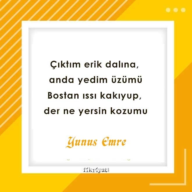 ➡ Yunus Emre, az sözle çok şey ifade eden şairdir. Öyle ki onun kaleme aldığı bir beyit hakkında sayfalarca açıklama yazılabilir. Hak dostu Yunus Emre, anlatmak istediği duyguyu sade ve fakat bir o kadar da derin işler. Örnek olarak şu dizeleri gösterebiliriz.