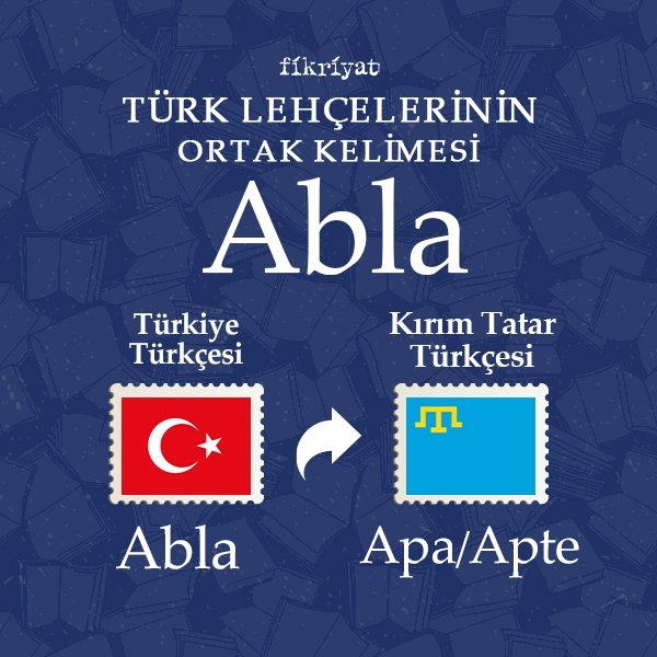 🔹 Osmanlı döneminde de çok yakından ilişkiler kurduğumuz Kırım Tatarlarının konuştuğu Kırım Türkçesinde "abla" kelimesi grubundaki diğer lehçeler ile aynı sözcük karşılamaktadır.