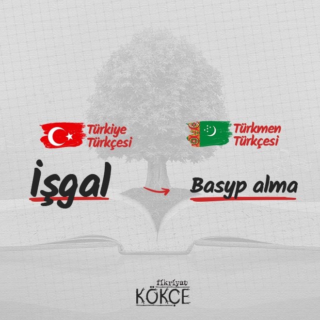 🔸 Güneybatı Türk lehçelerinden olan Türkmen Türkçesinde, Arapça kökneli işgal sözcüğünü "basyp alma" fiili karşılar.