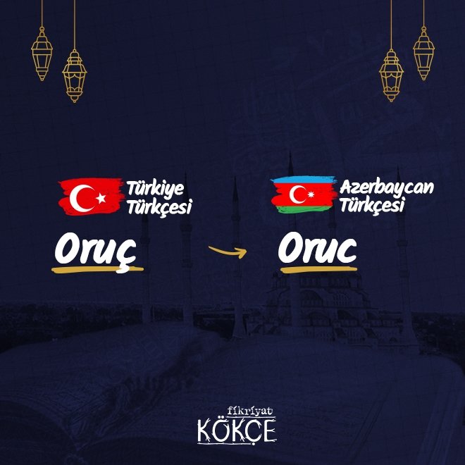 ◾ Oğuz grubundan olan Azerbaycan Türkçesinde "oruç" kelimesini "oruc" sözcüğü karşılamaktadır. Arapça kökenli kelimede bariz bir fark görülmese de -ç- değişimi olduğunu söylemek mümkündür.
