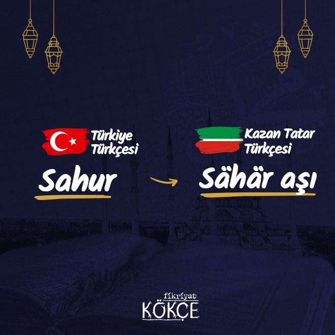 💠 Kuzeybatı Türk grubunun temcilsi Kazan Tatar Türkçesinde "sahur" sözcüğünü "sahar aşı" ifadesi karşılamaktadır.