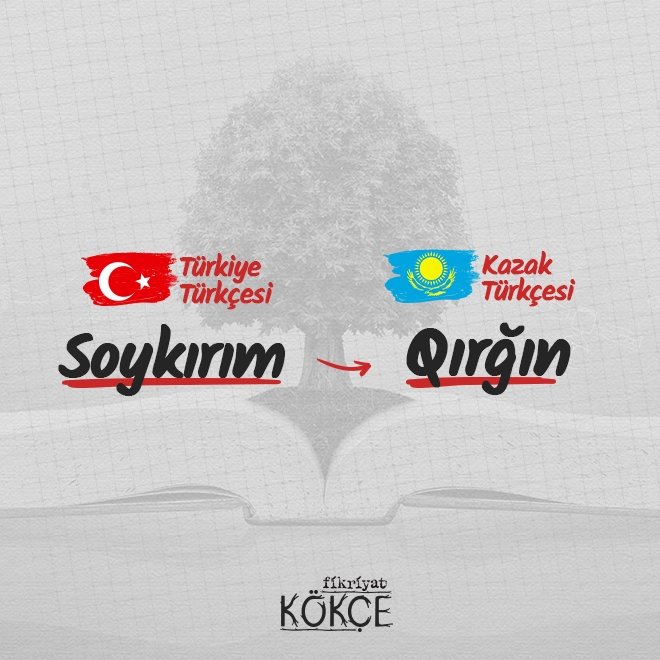 🔸 Kazak Türkçesi, kuzeybatı yani Kıpçak Türk lehçeler grubunda yer alır. Bu lehçede soykırım anlamını; qırğın, genocid, jappay qırw, qırğın, qoyşa bawızdaw, oyran sözcükleri karşılamaktadır.