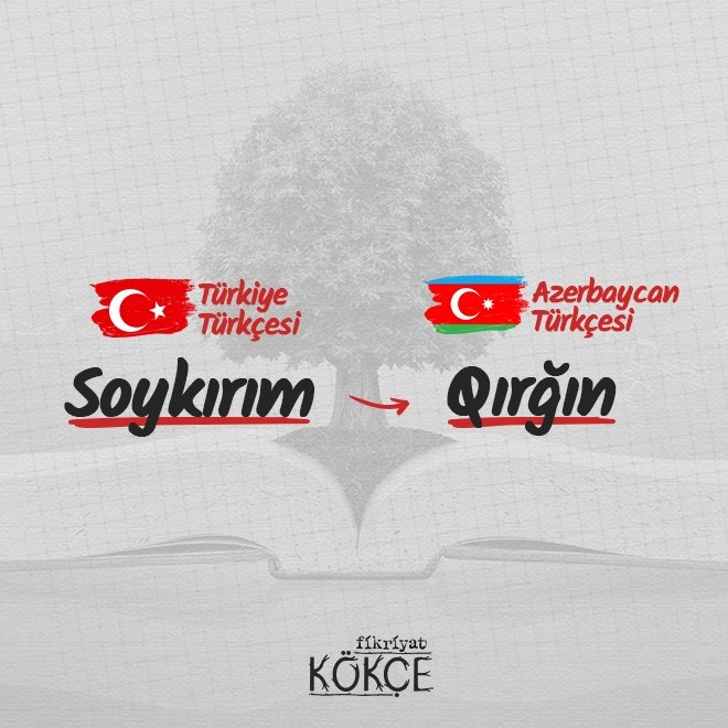 🔸 Azerbaycan Türkçesi, Eski Türkçe kelimeleri bünyesinde barındıran Oğuz grubuna mensup bir lehçedir. Azerbaycan lehçesinde katliam ve soykırım manalarına gelen soyqırım, qırğın kelimelerinin yanında İngilizceden alınan genosid ifadesi de yer almaktadır.