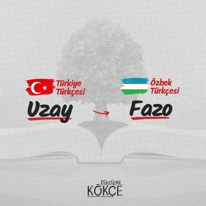 🔹 Özbek Türkçesinde uzay sözcüğünü, "fazo, koinot, kozmos" ifadeleri karşılamaktadır.