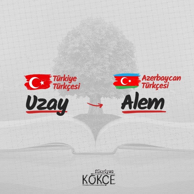 🔹 Azerbaycan Türkçesi'nde uzay sözcüğünü, "alem, kozmos ve uzaq" kelimeleri karşılar.
