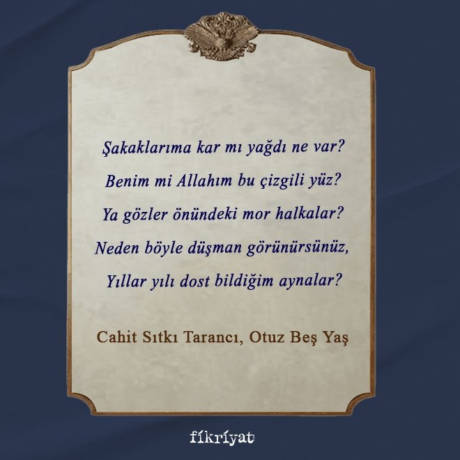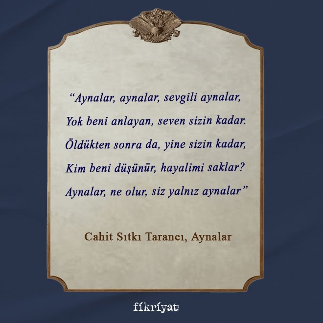 ◾Ölüm korkusunun yanı sıra yaşama sevinciyle de dikkat çeken, Türk edebiyatının en tanınmış şairlerinden biri olan Otuz Beş Yaş şairi Cahit Sıtkı Tarancı aynayı sık sık şiirlerinde kullanır. Suretiyle ve zamanla yüzleştiği aynalar aynı zamanda ruh haline göre başka duygulara kapı aralayan araçlar olmuştur. Evliliğinden önce daha karamsar bir yapıya sahip olan bunu şiirlerine yansıtan Tarancı, Otuz Beş Yaş şiirinde yaşlanmış suretine bakıp kendine yabancılaşır, dehşete kapılır ve aynalarla konuşur. Genç, taze ve görece daha umutlu suretine bakarken dost olan aynalar artık düşman kesilmiştir.