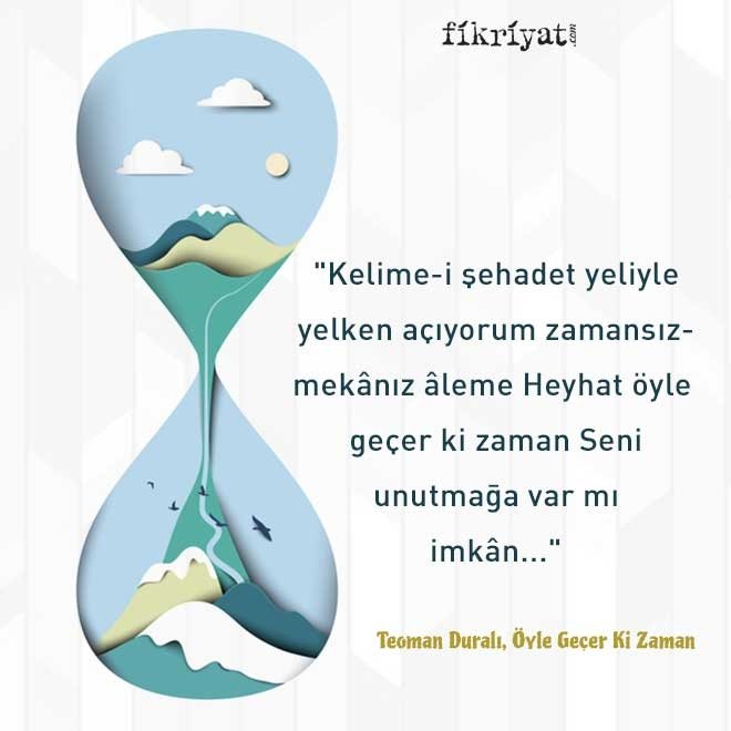 "Kelime-i şehadet yeliyle yelken açıyorum zamansız- mekânız âleme Heyhat öyle geçer ki zaman Seni unutmağa var mı imkân..."