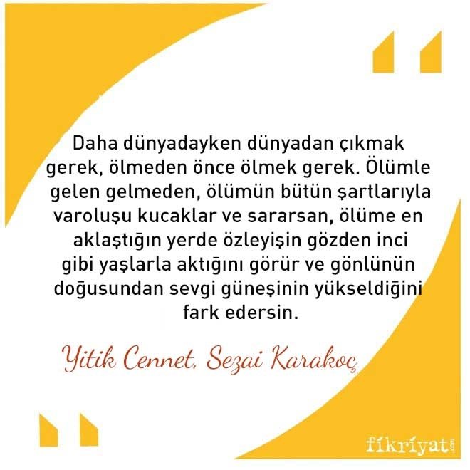 "Daha dünyadayken dünyadan çıkmak gerek, ölmeden önce ölmek gerek. Ölümle gelen gelmeden, ölümün bütün şartlarıyla varoluşu kucaklar ve sararsan, ölüme en yaklaştığın yerde özleyişin gözden inci gibi yaşlarla aktığını görür ve gönlünün doğusundan sevgi güneşinin yükseldiğini fark edersin."