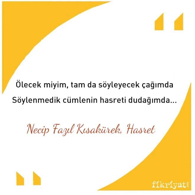 Hasret, bir şeyi çok isteyip ona kavuşamamaktan ileri gelen üzüntüdür. Bir imtihan yurdu olan dünyada insanlar, sevinç ile bu kederin arasında yaşar. Zira yeryüzünde her türlü hasretin gölgesi üstümüzden geçer. Öyle ki, Necip Fazıl "Söylenmedik cümlenin hasreti dudağımda" der. Her şeyin zıddı ile kaim olduğu dünyada bu üzüntü, aynı zamanda kavuşmanın habercisidir. Sizler için edebiyatımızın usta yazarlarından hasret hakkında alıntıları derledik.