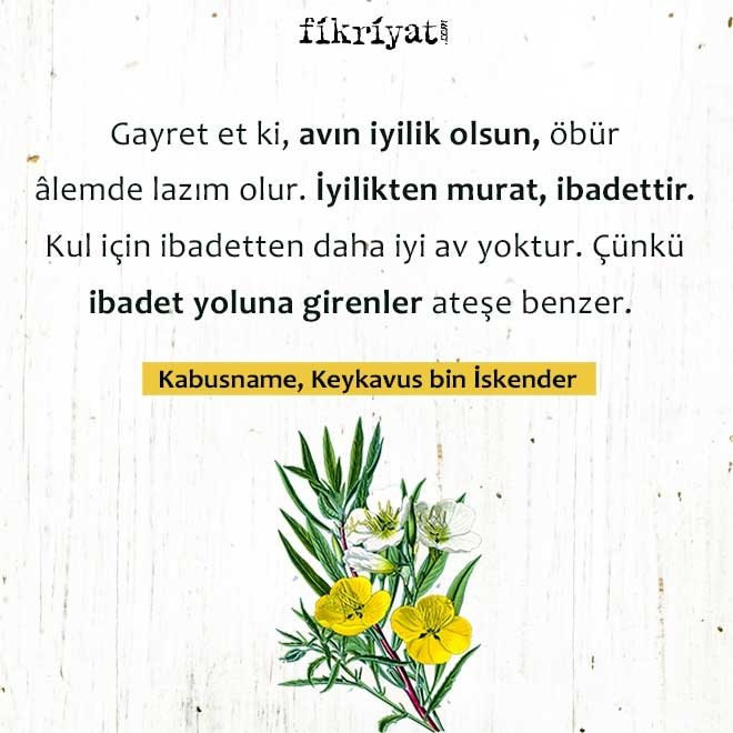 ◾ "Gayret et ki, avın iyilik olsun, öbür âlemde lazım olur. İyilikten murat, ibadettir. Kul için ibadetten daha iyi av yoktur. Çünkü ibadet yoluna girenler ateşe benzer. Ateşi ne kadar alçak yerde yaksalar, alevi o derece yükselir. İbadet yoluna varmayanlar da suya benzer, suyu ne kadar yukarı akıtılırlarsa akıtsınlar, aşağı düşer. İbadeti boynunun borcu bil, tâ ki alevin daima yükselsin."