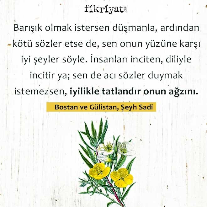 ◾ "Barışık olmak istersen düşmanla, ardından kötü sözler etse de, sen onun yüzüne karşı iyi şeyler söyle. İnsanları inciten, diliyle incitir ya; sen de acı sözler duymak istemezsen, iyilikle tatlandır onun ağzını."