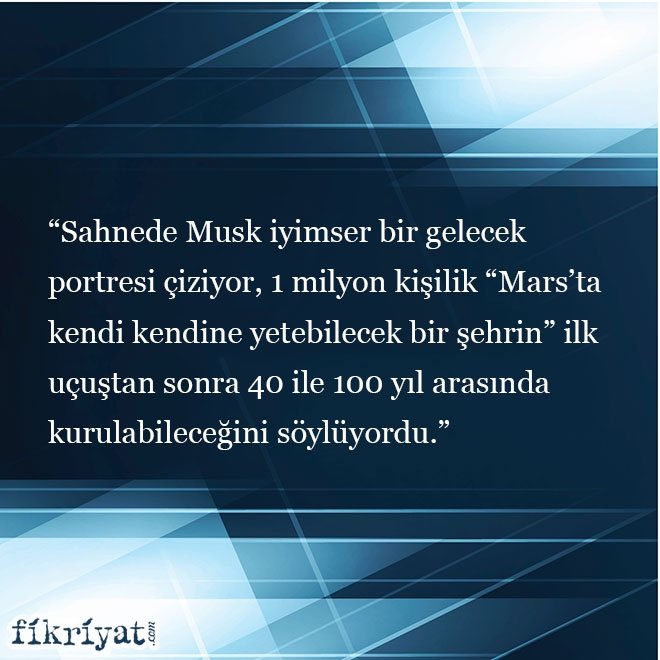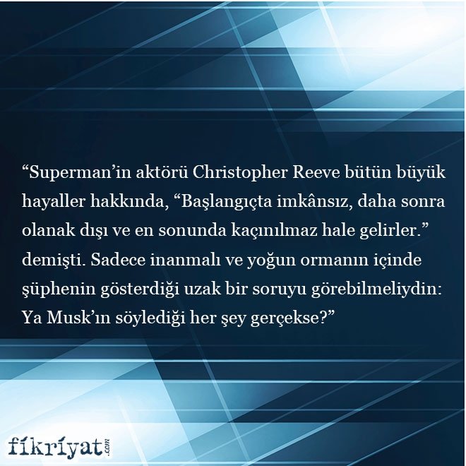 "Superman'in aktörü Christopher Reeve bütün büyük hayaller hakkında, "Başlangıçta imkânsız, daha sonra olanak dışı ve en sonunda kaçınılmaz hale gelirler." demişti. Sadece inanmalı ve yoğun ormanın içinde şüphenin gösterdiği uzak bir soruyu görebilmeliydin: Ya Musk'ın söylediği her şey gerçekse?"