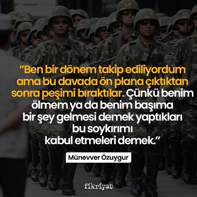 ◼ Ben Türkiye'deki kardeşlerime şunu söylemek istiyorum, Çin her zaman oyun kurmakta meşhur, 5000 senelik oyun mahareti olan, yaptığı hileli oyunlarıyla övünen bir ülke. Şimdi, o kadar insan öldü hapishanelerde kaldı, kamplarda öldü, kendi yandaşlarını, gazetecilerini ve politikacılarını Doğu Türkistan'a davet ederek orada "gayet iyi bir hayatın varlığını" göstermiş, hiçbir zaman zulüm yapılmadığına inandırmıştır.