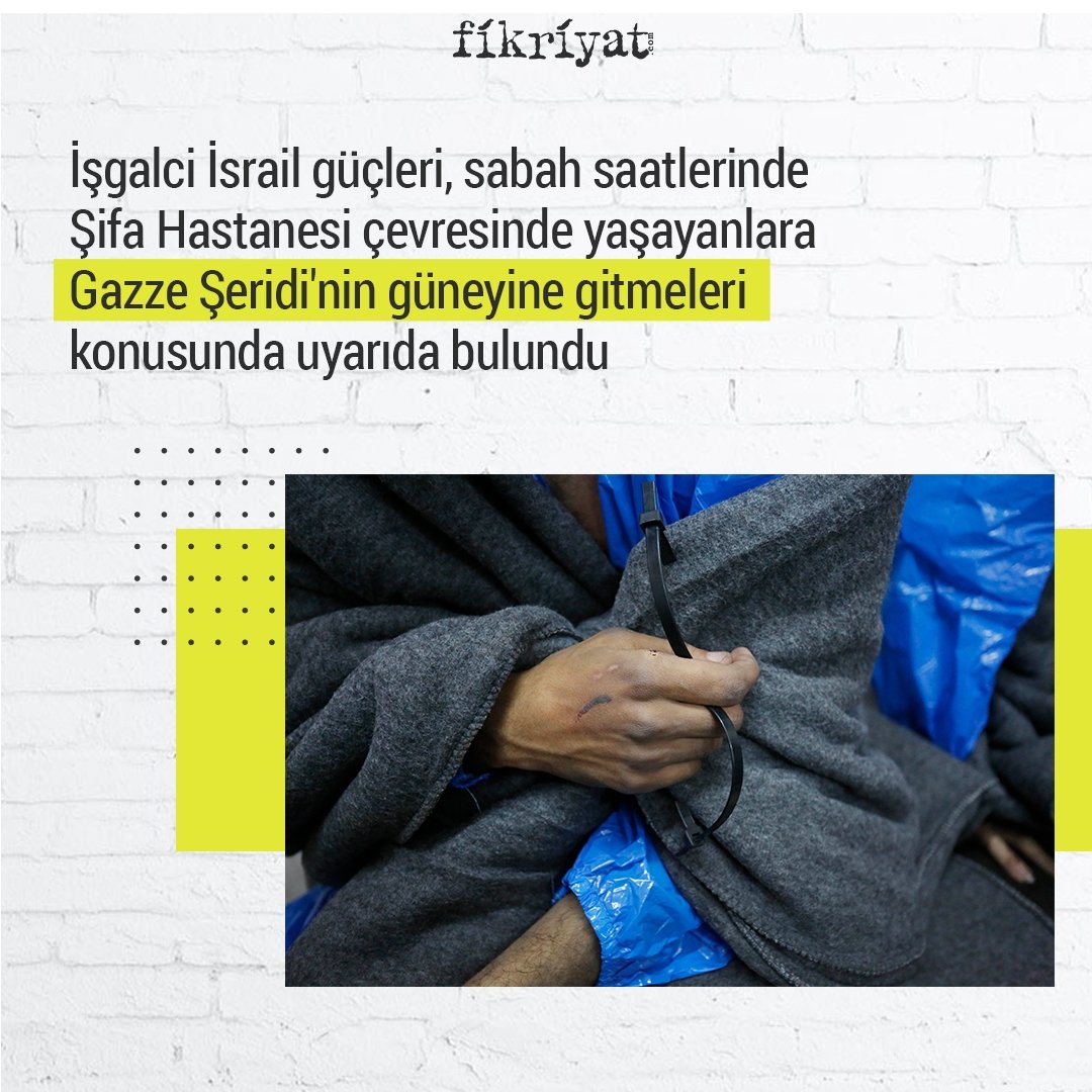 🔹 Yerel kaynaklara göre işgalci ordusu, sabah saatlerinde Şifa Hastanesi çevresinde yaşayanlara hoparlörler aracılığıyla evlerini boşaltmaları ve Gazze Şeridi'nin güneyine gitmeleri konusunda uyarıda bulundu.