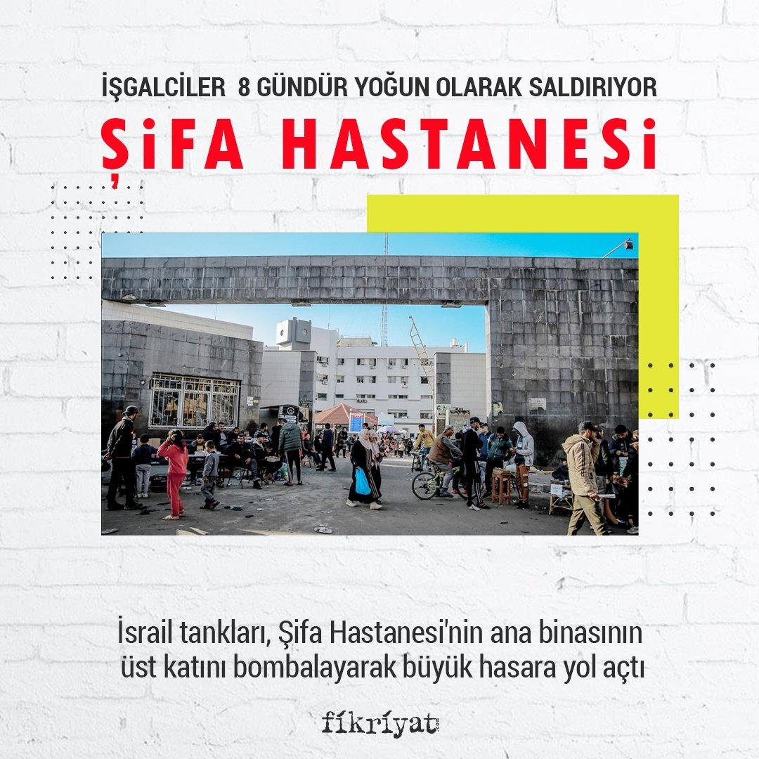 18 Mart'ta işgalci askerlerin başlattığı operasyonla büyük bir zulme tanık olan Şifa Hastanesi dünyanın gündeminde. Hastane kompleksi içinde binlerce insan mevcutken İşgalci İsrail tankları, Şifa Hastanesi'nin ana binasının üst katını bombalayarak büyük hasara yol açtı. İnsan hakları ihlaline umarsızca devam eden işgalci zihniyet hastanede üzerindeki zulmünü sürdürerek Filistinli nüfusu bölgeden kaydırmanın peşinde.