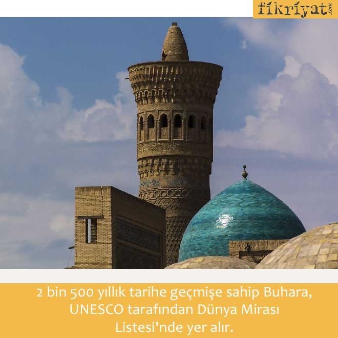 📌 Türk-İslam mimarisine ait ihtişamlı camilere, yüksek minarelere, mavinin farklı tonlarının kullanıldığı kervansaraylara ve çinilerle kaplı medreselere sahip olan Buhara, yetiştirdiği bilim ve din adamlarıyla dünyada "Kubbet-ül İslam" unvanına sahip.