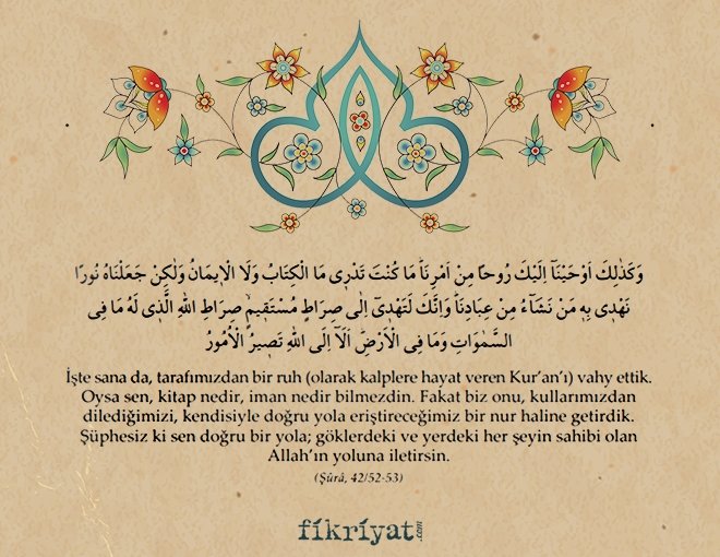 "İşte sana da, tarafımızdan bir ruh (olarak kalplere hayat veren Kur'an'ı) vahy ettik. Oysa sen, kitap nedir, iman nedir bilmezdin. Fakat biz onu, kullarımızdan dilediğimizi, kendisiyle doğru yola eriştireceğimiz bir nur haline getirdik. Şüphesiz ki sen doğru bir yola; göklerdeki ve yerdeki her şeyin sahibi olan Allah'ın yoluna iletirsin. "