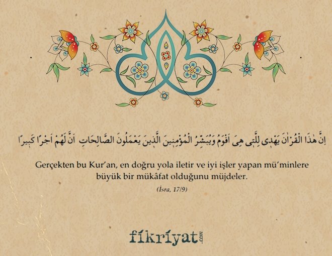 "Gerçekten bu Kur'an, en doğru yola iletir ve iyi işler yapan mü'minlere büyük bir mükâfat olduğunu müjdeler. "