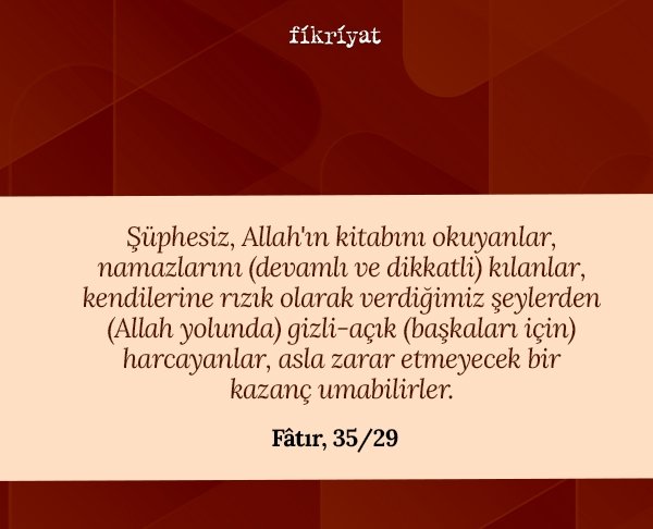 Şüphesiz, Allah'ın kitabını okuyanlar, namazlarını (devamlı ve dikkatli) kılanlar, kendilerine rızık olarak verdiğimiz şeylerden (Allah yolunda) gizli-açık (başkaları için) harcayanlar, asla zarar etmeyecek bir kazanç umabilirler.