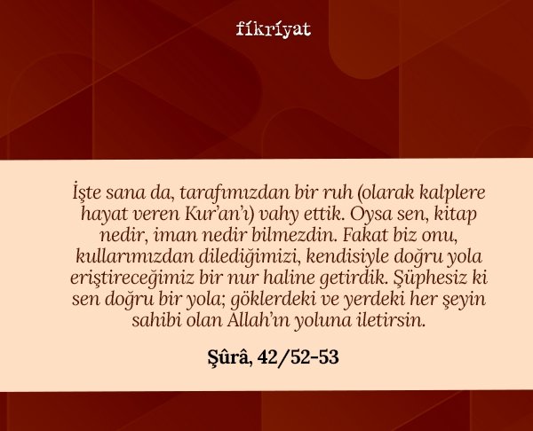 İşte sana da, tarafımızdan bir ruh (olarak kalplere hayat veren Kur'an'ı) vahy ettik. Oysa sen, kitap nedir, iman nedir bilmezdin. Fakat biz onu, kullarımızdan dilediğimizi, kendisiyle doğru yola eriştireceğimiz bir nur haline getirdik. Şüphesiz ki sen doğru bir yola; göklerdeki ve yerdeki her şeyin sahibi olan Allah'ın yoluna iletirsin.