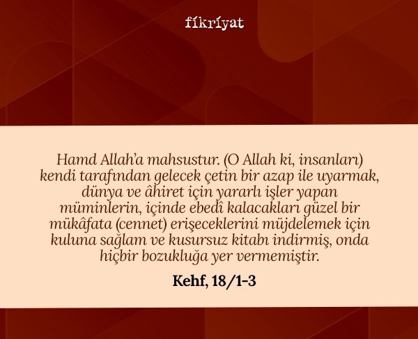 Hamd Allah'a mahsustur. (O Allah ki, insanları) kendi tarafından gelecek çetin bir azap ile uyarmak, dünya ve âhiret için yararlı işler yapan müminlerin, içinde ebedî kalacakları güzel bir mükâfata (cennet) erişeceklerini müjdelemek için kuluna sağlam ve kusursuz kitabı indirmiş, onda hiçbir bozukluğa yer vermemiştir.