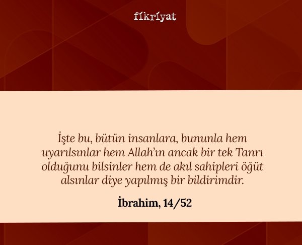 İşte bu, bütün insanlara, bununla hem uyarılsınlar hem Allah'ın ancak bir tek Tanrı olduğunu bilsinler hem de akıl sahipleri öğüt alsınlar diye yapılmış bir bildirimdir.