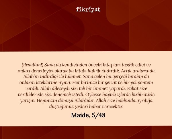 (Resulüm!) Sana da kendisinden önceki kitapları tasdik edici ve onları denetleyici olarak bu kitabı hak ile indirdik. Artık aralarında Allah'ın indirdiği ile hükmet. Sana gelen bu gerçeği bırakıp da onların isteklerine uyma. Her birinize bir şeriat ve bir yol yöntem verdik. Allah dileseydi sizi tek bir ümmet yapardı. Fakat size verdikleriyle sizi denemek istedi. Öyleyse hayırlı işlerde birbirinizle yarışın. Hepinizin dönüşü Allah'adır. Allah size hakkında ayrılığa düştüğünüz şeyleri haber verecektir.