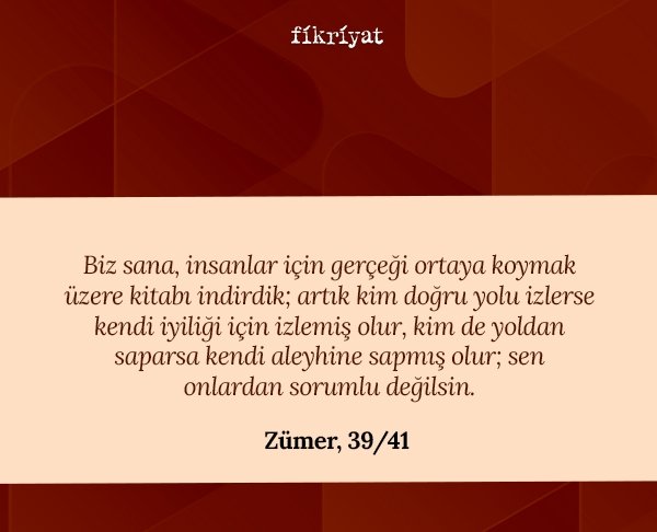 Biz sana, insanlar için gerçeği ortaya koymak üzere kitabı indirdik; artık kim doğru yolu izlerse kendi iyiliği için izlemiş olur, kim de yoldan saparsa kendi aleyhine sapmış olur; sen onlardan sorumlu değilsin.