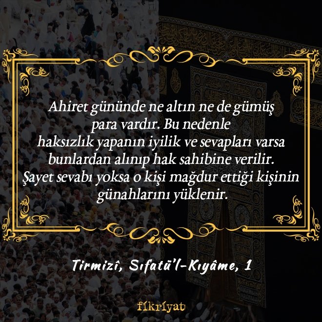 "Ahiret gününde ne altın ne de gümüş para vardır. Bu nedenle haksızlık yapanın iyilik ve sevapları varsa bunlardan alınıp hak sahibine verilir. Şayet sevabı yoksa o kişi mağdur ettiği kişinin günahlarını yüklenir." (Tirmizî, Sıfatü"l-Kıyâme, 1)