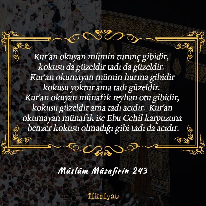 "Kur'an okuyan mümin turunç gibidir, kokusu da güzeldir tadı da güzeldir. Kur'an okumayan mümin hurma gibidir. Kokusu yoktur ama tadı güzeldir. Kur'an okuyan münafık reyhan otu gibidir, kokusu güzeldir ama tadı acıdır. Kur'an okumayan münafık ise Ebu Cehil karpuzuna benzer, kokusu olmadığı gibi tadı da acıdır. (Müslüm Müsafirin 243)